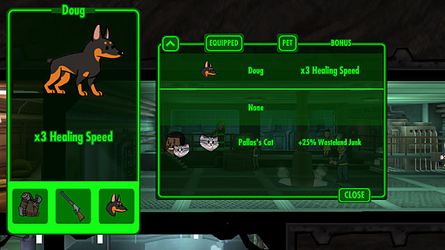 Pets are useful here, too. I opted to equip my adventuring dweller with Doug, who will heal that character 3 times faster out in the Wasteland. That actress survivability was a huge boost to the amount of fourth dimension my dweller could spend on the outside, which of form translated to fifty-fifty better loot collections when he finally returned.
